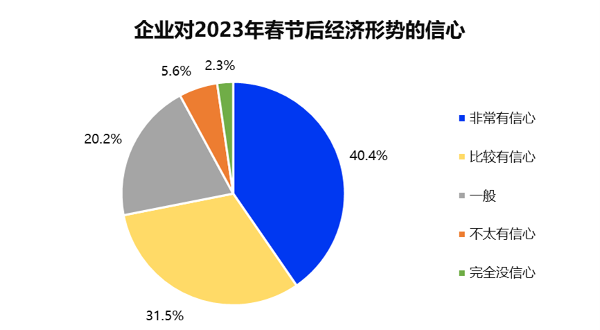 智联招聘春节后面向企业的调研数据显示,40.4%的企业对春节后经济形势非常有信心,31.5%表示比较有信心,共计71.9%的企业看好经济走势,对经济发展具备信心。表明随着疫情管控放开、全力拼经济政策信号的释放,企业信心明显提升。