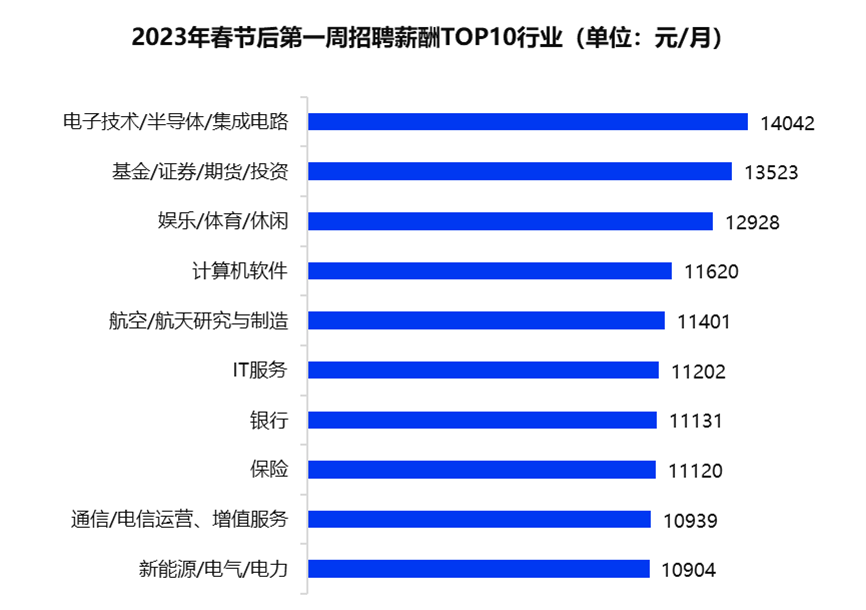 · 节后首周平均招聘薪酬10038元/月,集成电路行业首次登顶