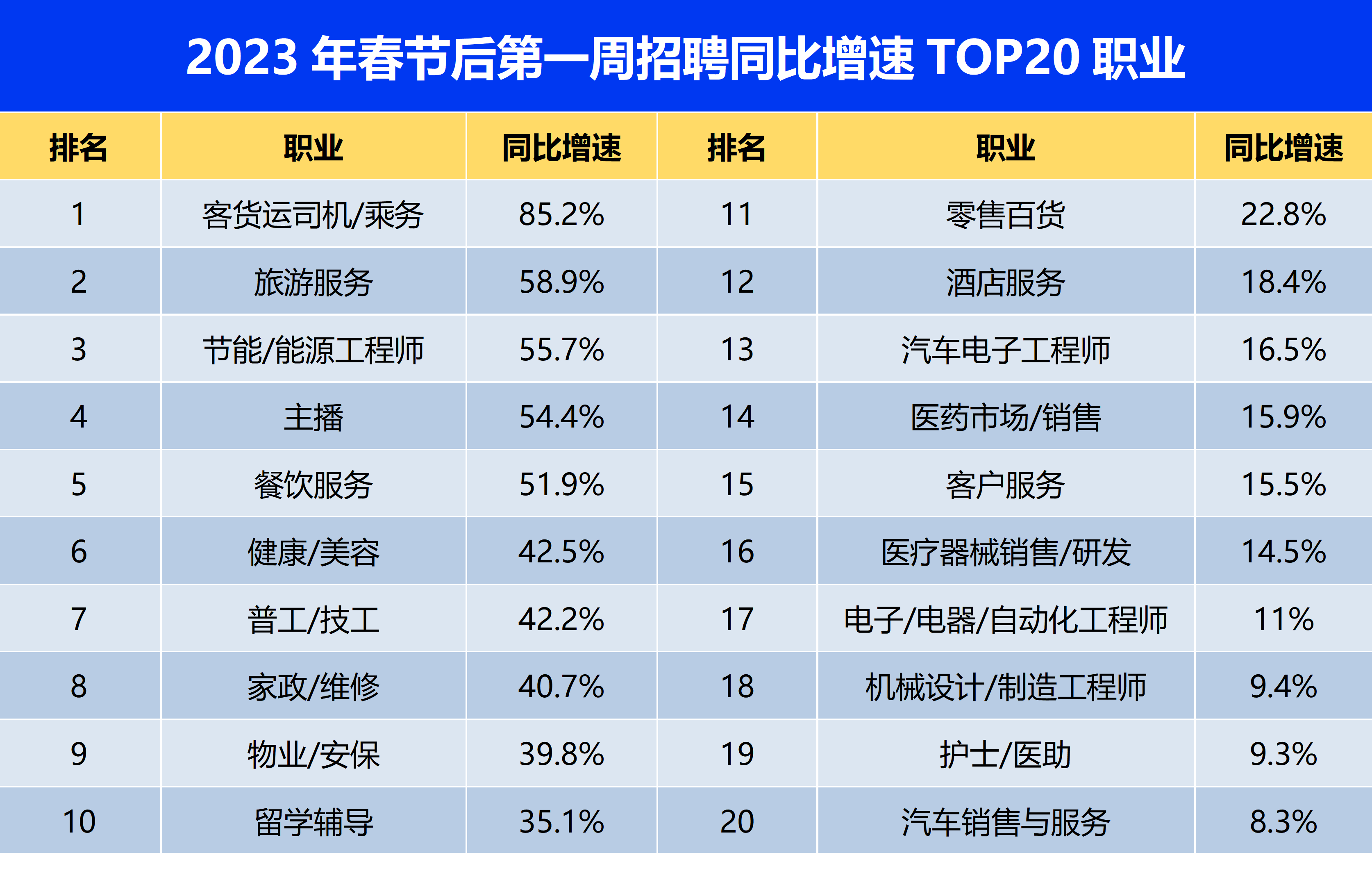 春节后第一周,客货运司机/乘务招聘职位数同比增长85.2%,排名各职业之首。旅游服务则以58.9%的增速排名第二。“放开”后的交通运输更繁忙,旅游业需求量增大,促进相应岗位招聘需求激增。