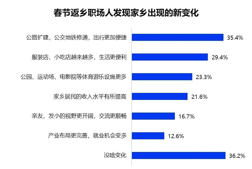 在春节返乡的职场人中,仅有36.2%认为家乡没啥变化,而高达63.8%的受访者认为家乡越来越好。其中,35.4%认为“公路扩建,公交地铁修通,出行更加便捷”,29.4%认为“服装店、奶茶店、小吃店越来越多,生活更便利”。日新月异的家乡,平添了求职者回归的故土情怀。