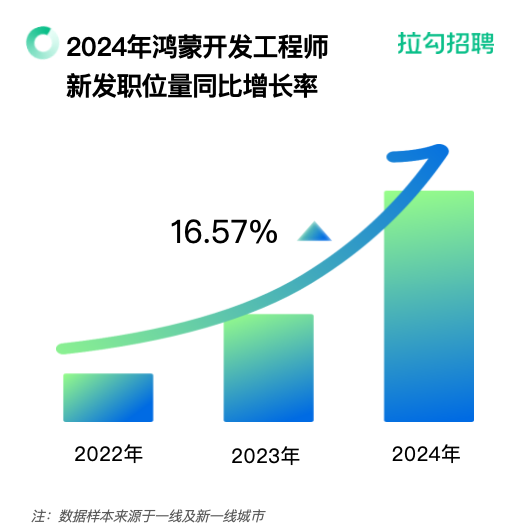 拉勾招聘数据显示, 截至2024年11月,鸿蒙开发工程师的新发职位量较去年同期增长16.57%,增势明显。