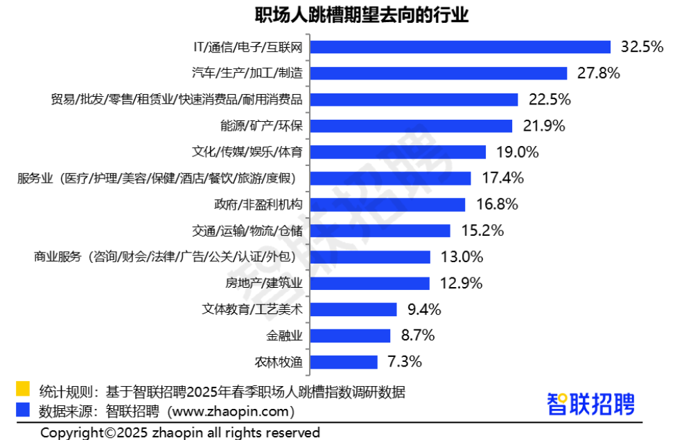 2025年政府工作任务强调要持续推进“人工智能+”行动,加快发展绿色低碳经济,将数字技术与制造优势、市场优势更好结合起来,支持大模型广泛应用,大力发展智能网联新能源汽车,打造具有国际竞争力的数字产业集群。新技术蓬勃发展、政策积极引导,职场人的跳槽意愿也受到较大程度的影响。