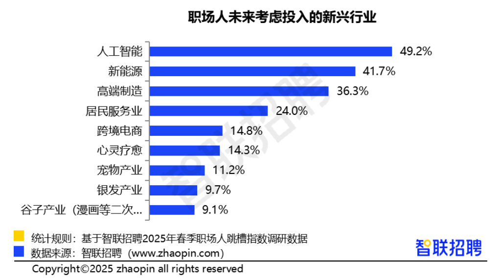 聚焦新兴领域,智联招聘数据显示,有跳槽意愿或行动的职场人中,49.2%希望未来能投身到人工智能领域,其次是新能源领域,占比41.7%。前五的热门新兴领域还有高端制造、居民服务业、跨境电商,比例分别为36.3%、24%、14.8%。