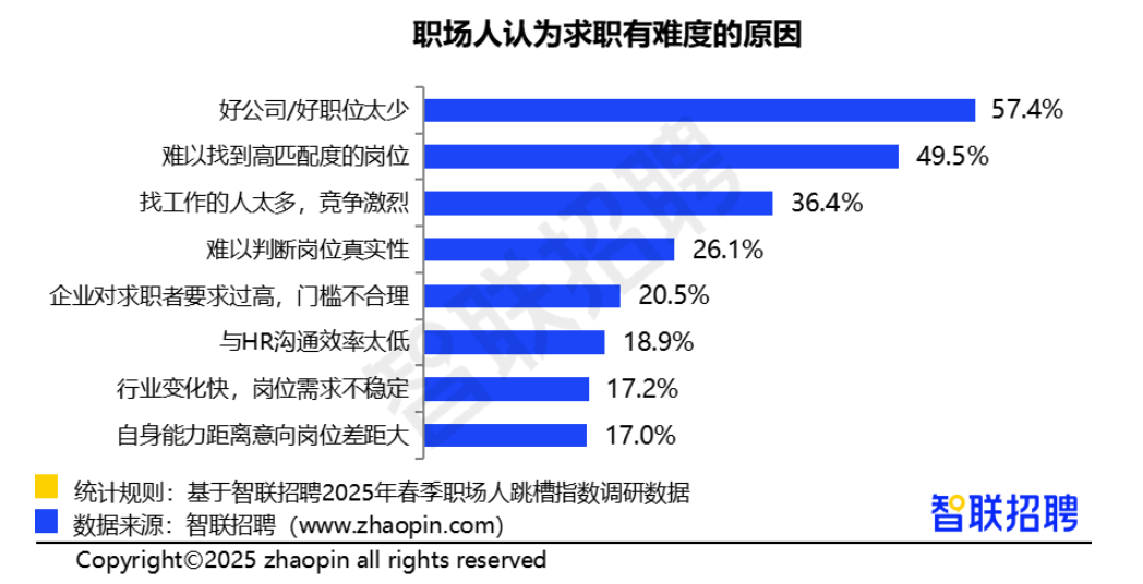 57.4%的职场人认为求职有难度的原因是“好公司/好职位太少”,占比最高;49.5%认为“难以找到高匹配度的岗位”,36.4%表示“找工作的人太多,竞争激烈”,还有26.1%表示“难以判断岗位真实性”。大部分职场人将求职难归结于外因,认为自身能力有差距的仅占17%。需要提醒职场人的是,随着时代的变化,判断好公司、好职位的标准也应该相应有所转变,同时要结合自身的实际情况择行择业。