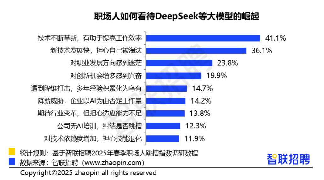 DeepSeek等大模型日臻成熟, 41.1%的职场人表示技术不断革新,有助于提高自身工作效率,占比最高。但另一方面,新技术的强大也加深了职场人对未来发展的担忧,有36.1%的职场人担忧技术发展过快会导致被替代。其中,客服岗位的职场人对大模型的应用尤为敏感,选择“担心自己被淘汰”的比例高达49.5%。当前,确实可以看到各行各业的AI客服“上岗”,这对客服岗位职场人的心态影响较大。也提醒职场人,面对技术变革,需主动适应,通过持续学习和实践,增强综合素质,化被动为主动,创造新的职业增长曲线。