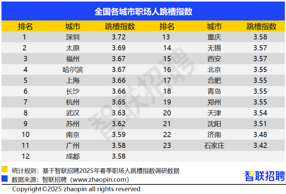深圳职场人跳槽指数最高,石家庄职场人跳槽指数最低