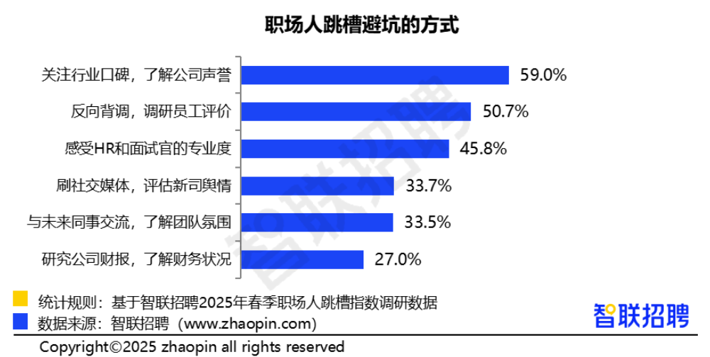 找工作的过程中最怕遇到“表里不一”的公司,关于如何有效避坑,59%的职场人认为应该关注行业口碑,了解公司声誉,占比最高;50.7%认为可以“反向背调员工评价”,还有45.8%通过感受HR和面试官的专业度来评判。