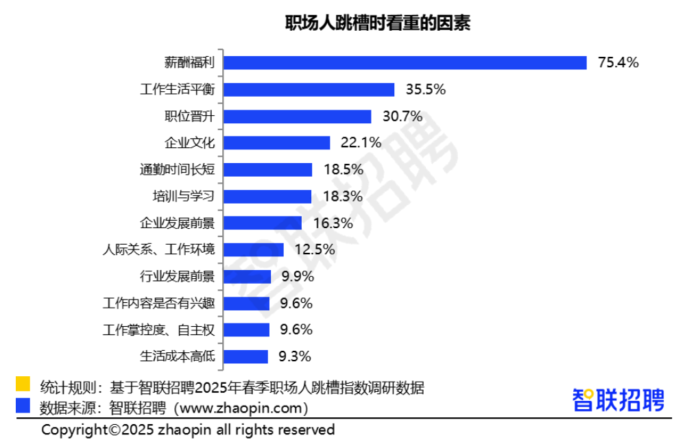 在被问及跳槽时最看重什么时,75.4%的职场人选择了薪酬福利,占比最高,高于2024年的67.3%。其次是工作生活平衡,占比35.5%,职位晋升以30.7%的比例排列第三。