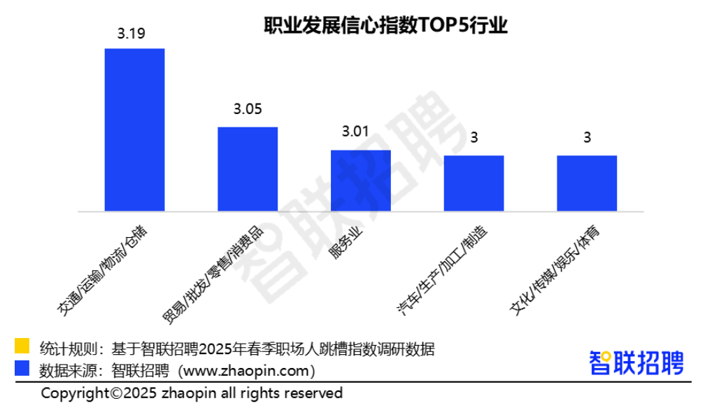 从不同行业来看,交通/运输的职场人信心指数最高,达到3.19,其次是贸易/批发、服务业、汽车/生产/制造,整体来看,蓝领对职业发展的信心更强。当前,AI能新技术的发展对白领工作的影响较大,更大程度影响了白领的心态,而蓝领心态则相对稳定,并且随着旅游、生活服务等领域的复苏增长,以及新制造、新能源的蓬勃发展,蓝领的信心随之增长。