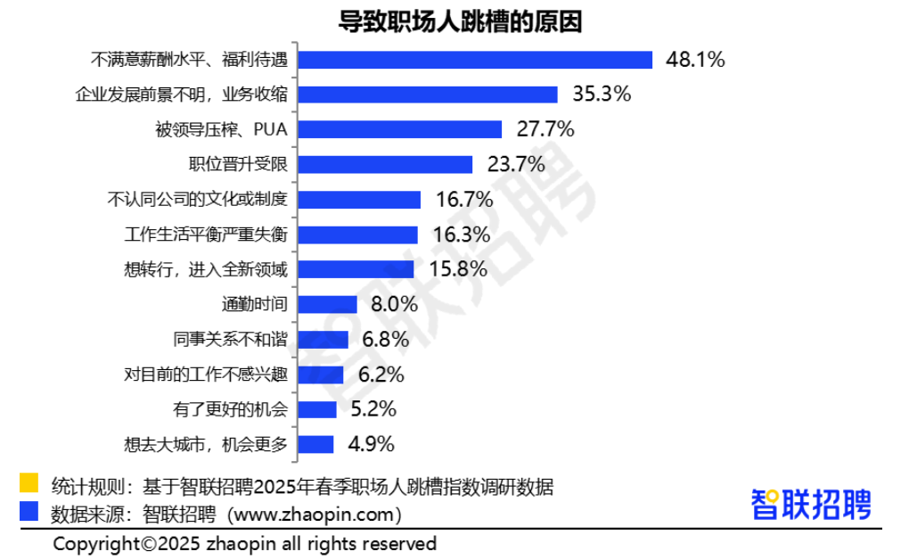 数据显示,2025年春季职场人跳槽的首要原因是“不满意薪酬水平,福利待遇”,占比达48.1%,较去年的47.4%有所上涨。其次是“企业发展前景不明,业务收缩”“被领导压榨、PUA”,占比分别为35.3%和27.7%。