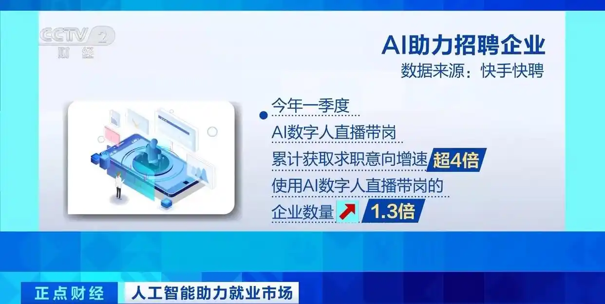 调研显示,今年春招近50%的招聘企业,通过AI面试等方式进行招聘;19%的招聘企业正在部署AI大模型,以用于简历筛选、面试等场景。今年一季度,AI数字人直播带岗累计获取求职意向增速超4倍,使用AI数字人直播带岗的企业数量增长了1.3倍。