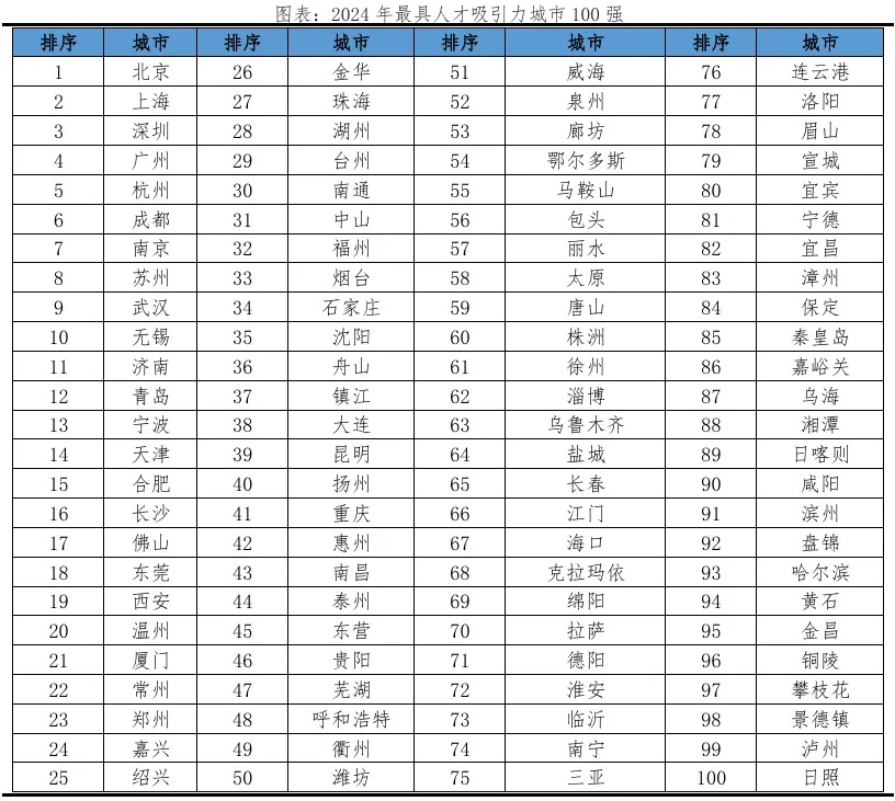 1)2024年中国最具人才吸引力城市100强:北京连续多年占据榜首。从结果看,2024年前十城市与2023年相比无位次变动,依旧是北京、上海、深圳、广州、杭州、成都、南京、苏州、武汉、无锡位居前十。
